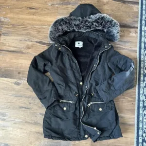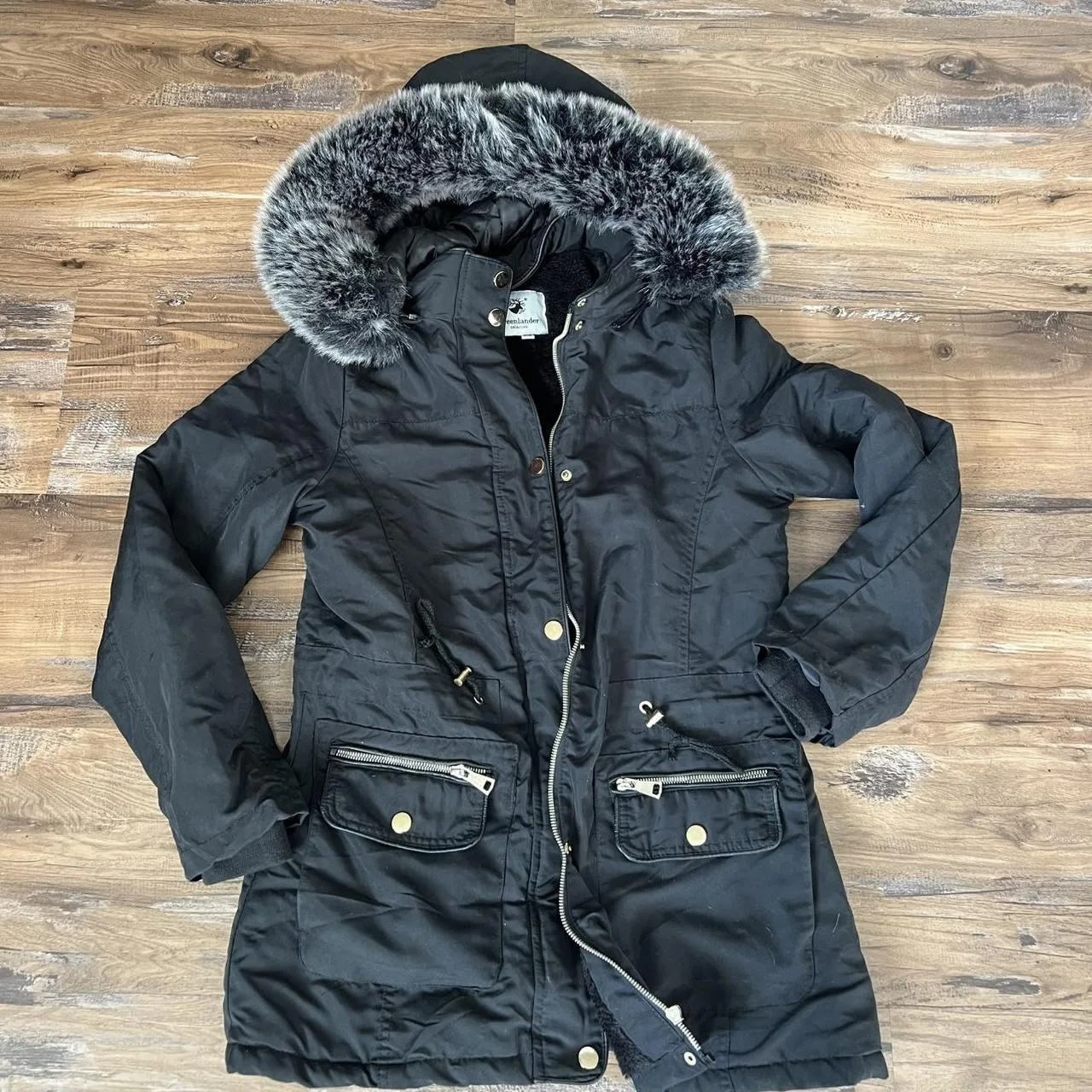 Greenlander Black Hooded Parka Coat Faux Fur Lined Drawstring Waist Mid-Length M
