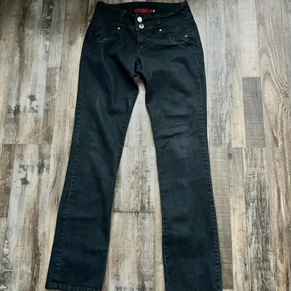 dark wash, bootcut, low-rise, stretch denim, y2k style, grunge, black jeans, women’s fit, tapered leg, retro vibe