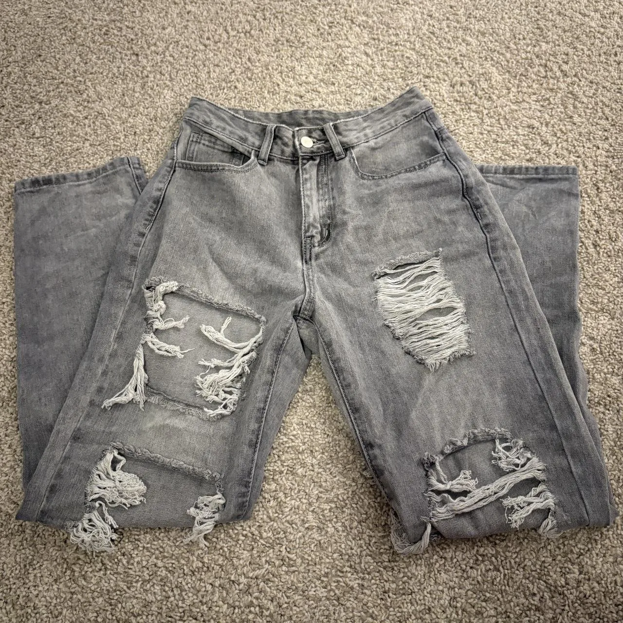 grey distressed, high waisted, ripped jeans, raw hem, vintage vibe, boyfriend fit, grunge style, casual denim, edgy pants, everyday wear