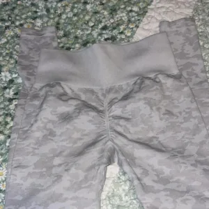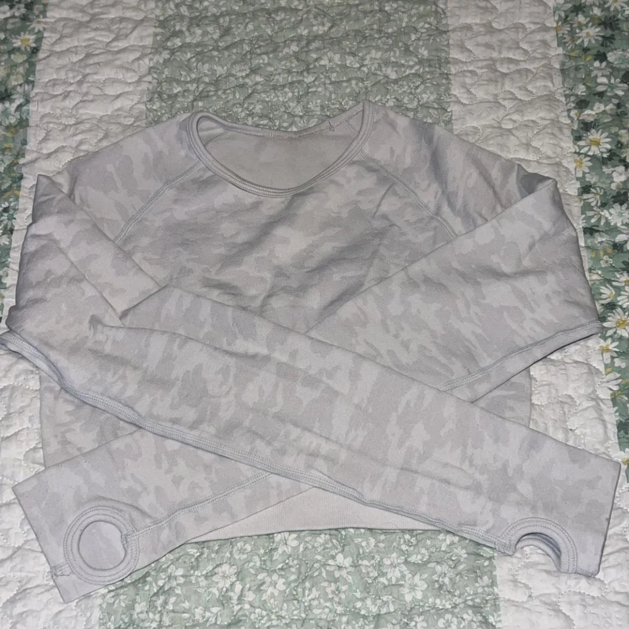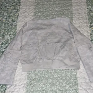 So cute! Has scrunch butt, thumb holes, hole in the middle of the back of the crop top. Thick material but still plenty stretchy