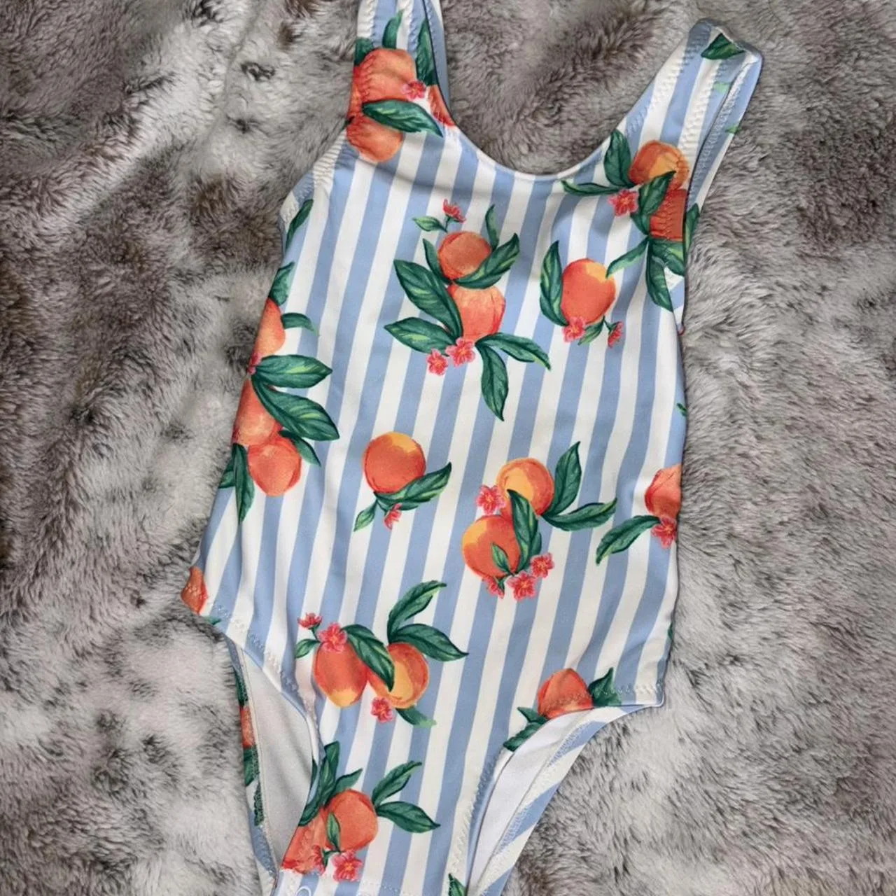 Blue and white striped one piece swimsuit with peach print #swimwear #summer