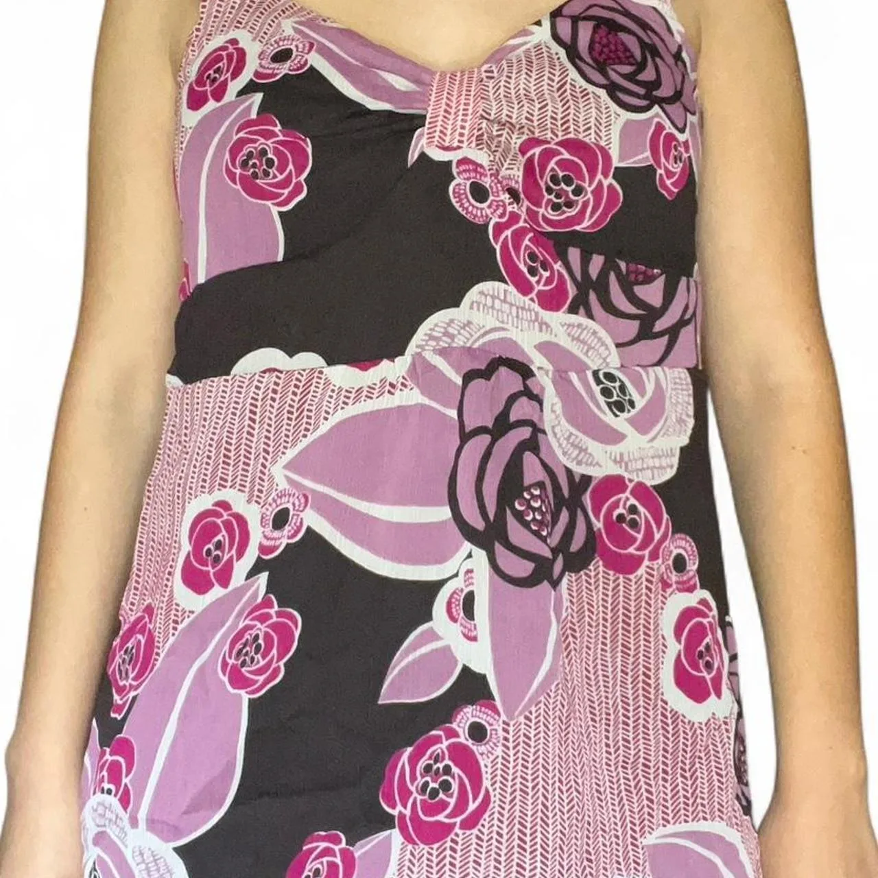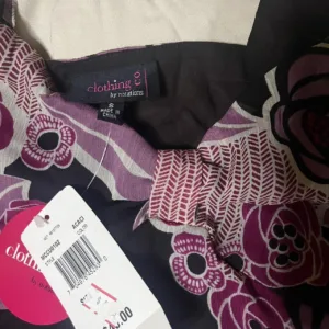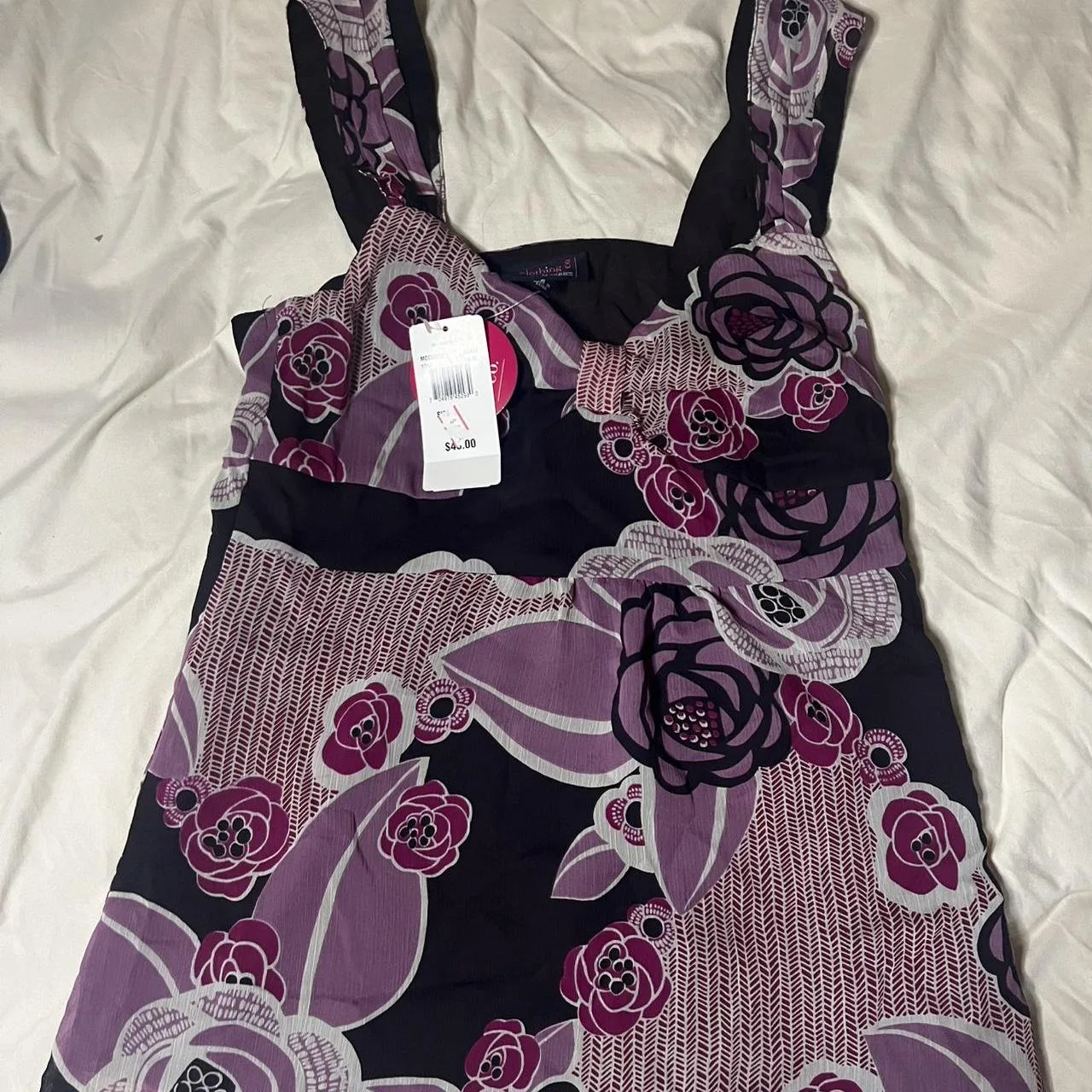 purple floral top, black floral print, y2k style, vintage inspired, feminine blouse, statement straps, retro aesthetic, floral pattern, new with tags