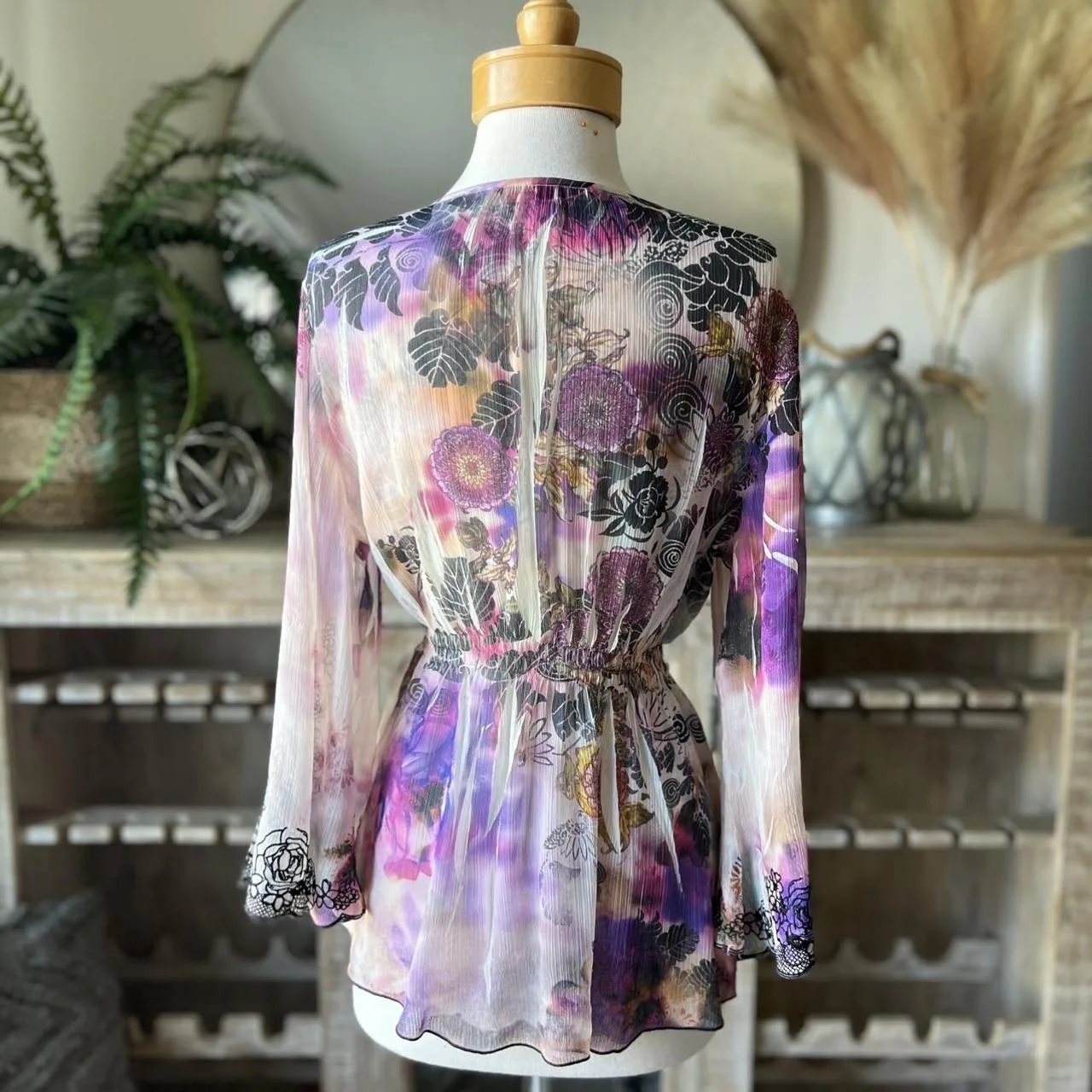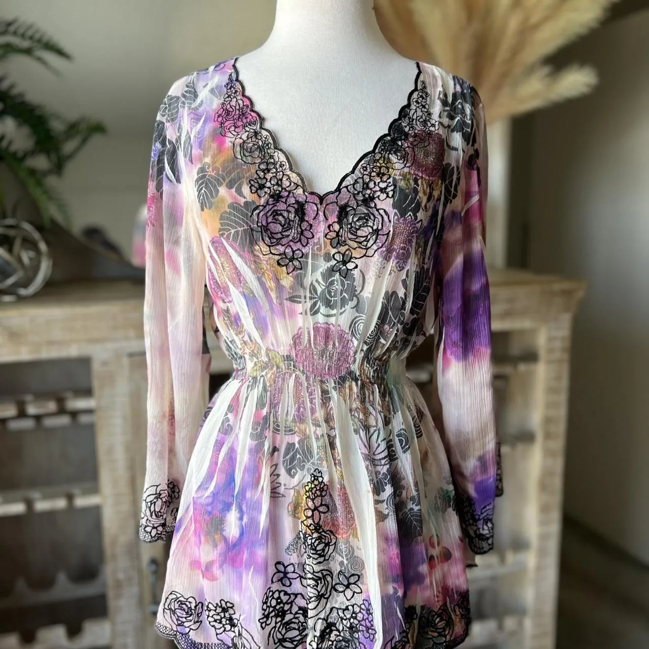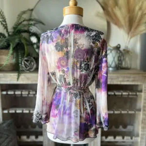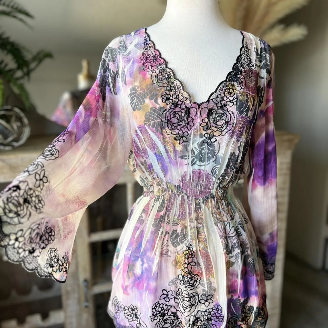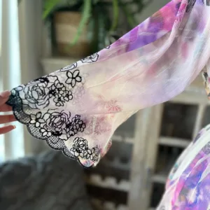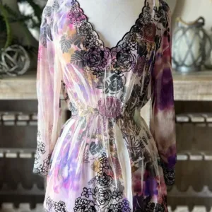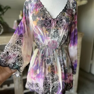 Purple tie-dye floral sheer top with long bell sleeves, V-neckline and black floral detail trim #BohoChic #Boho #Bohovibes #tie -dye