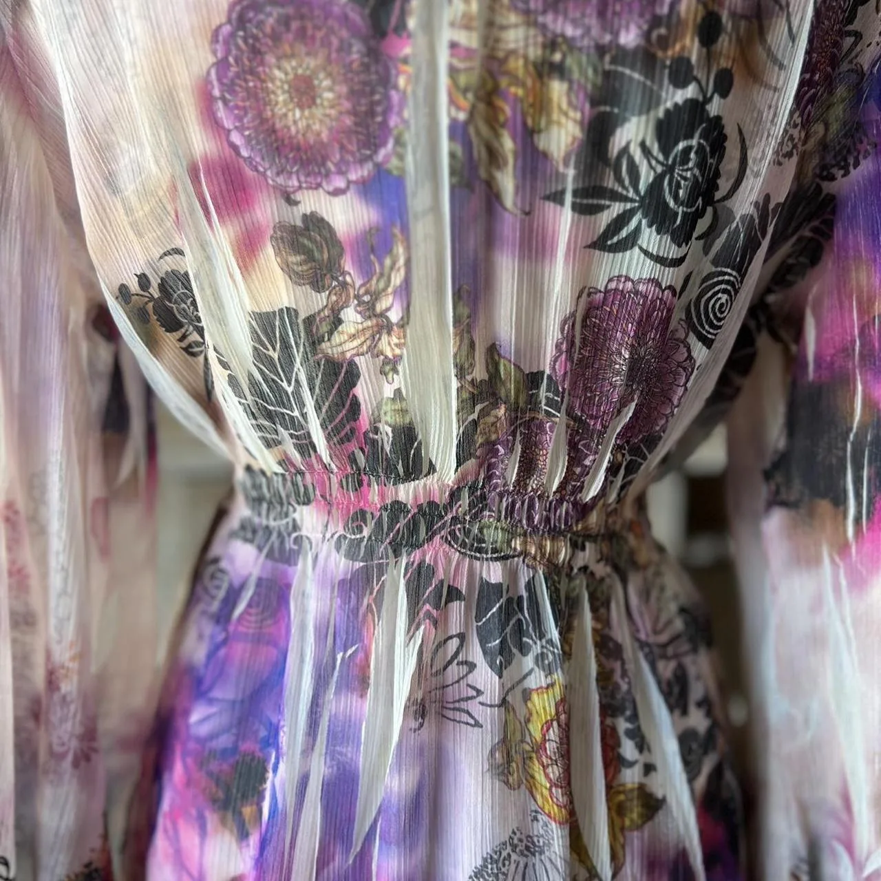 tie-dye floral, sheer blouse, bell sleeves, boho top, flowy tunic, v-neck, floral trim, bohemian style, lightweight fabric, vibrant colors
