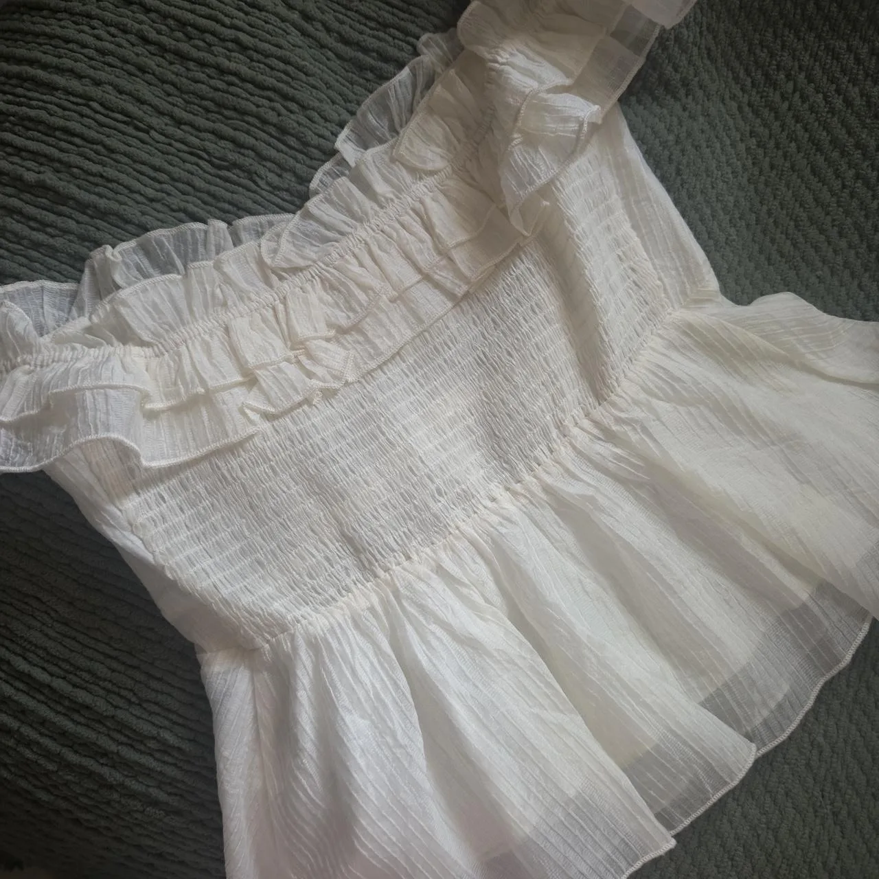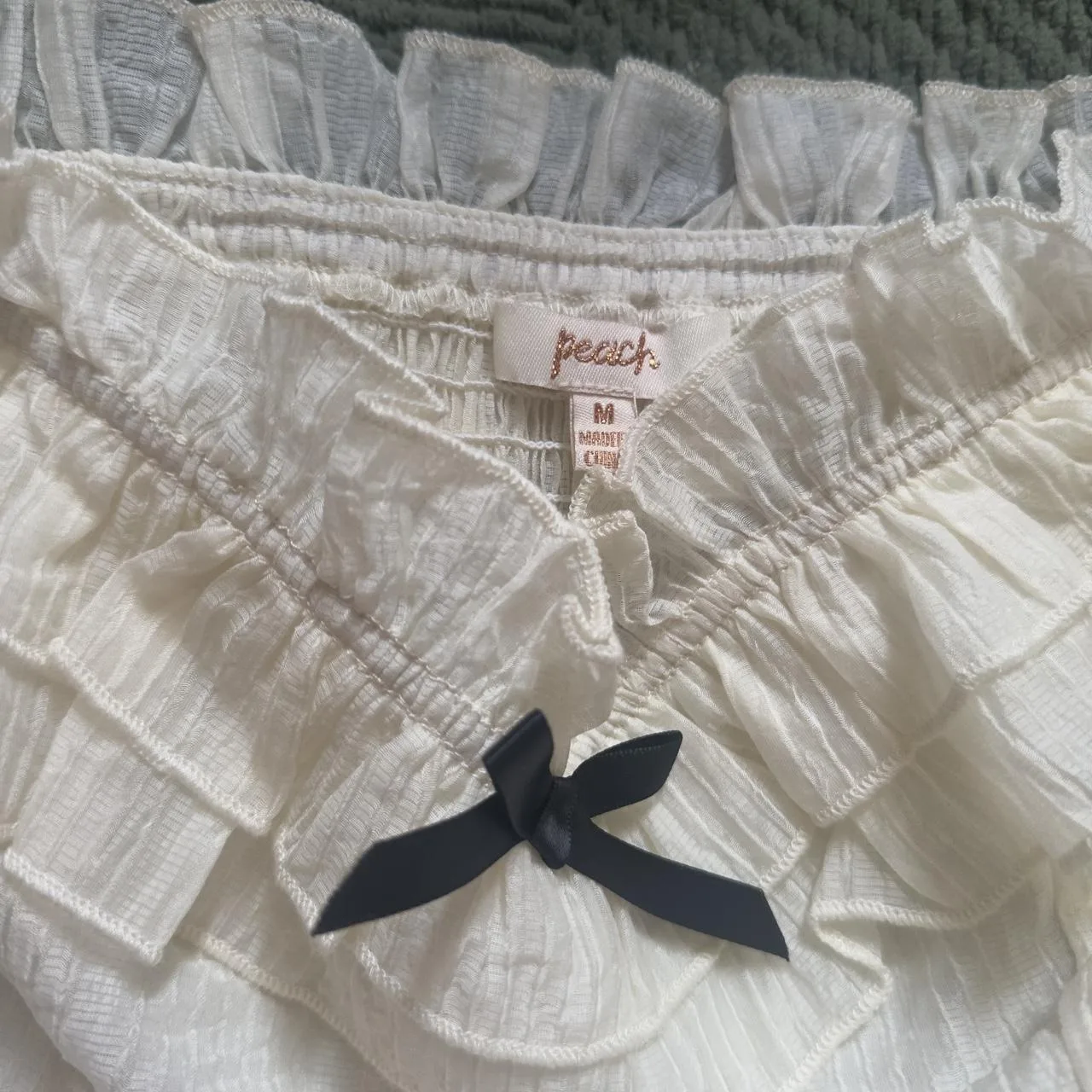 pretty ruffle top with bow detailing !! it could be off the shoulder or worn on the shoulder! gives cute coquette princess vibes! tag says from a brand called peach!