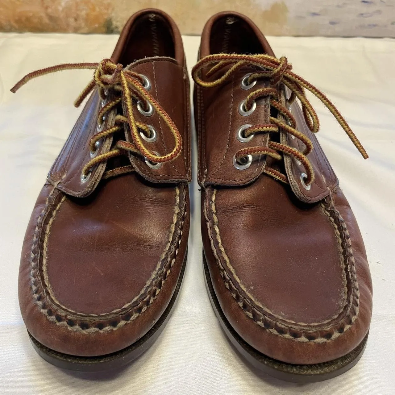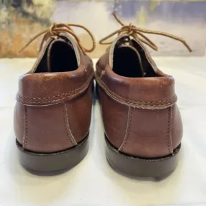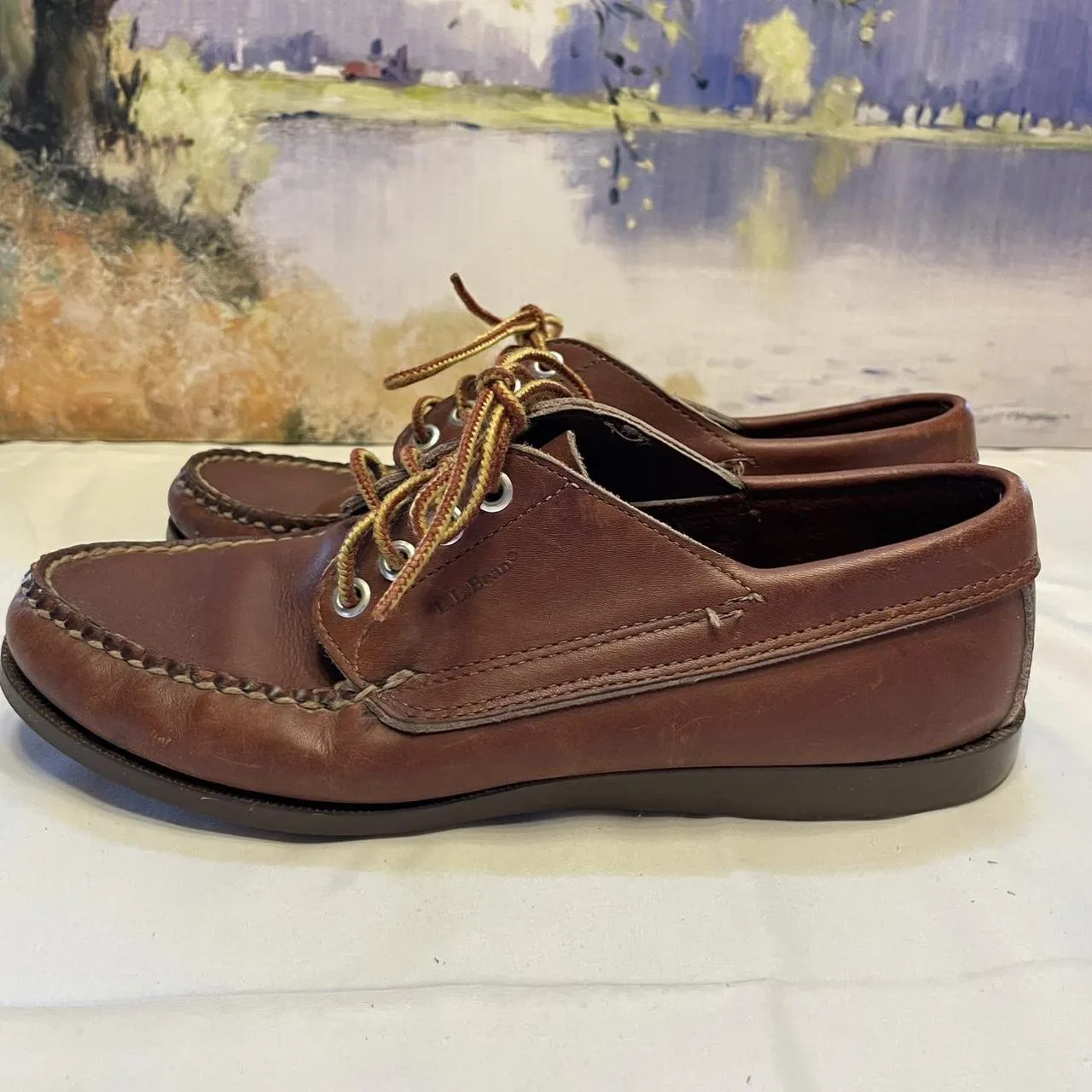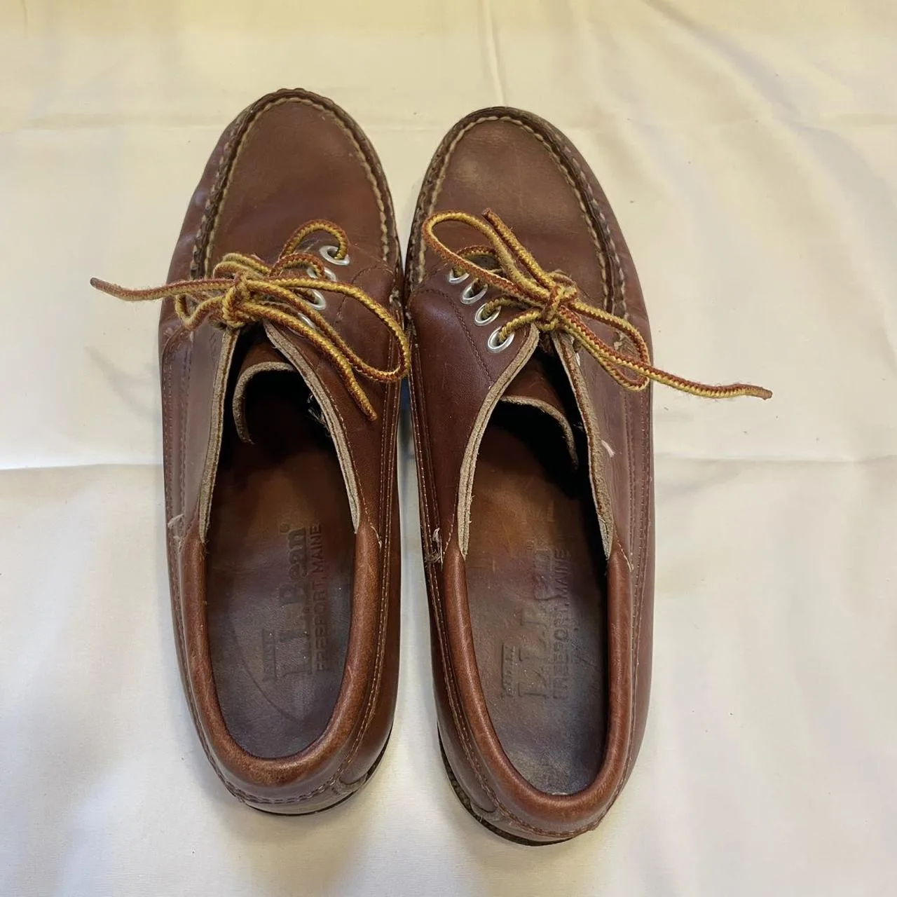 Classic L.L. Bean brown leather boat shoes with a worn-in patina that only gets better with age. Traditional moc-toe style with lace-up front and sturdy rubber soles. Broken-in and comfortable with visible wear that adds to the fisherman-core / heritage vibe.