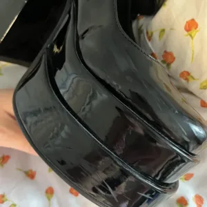 platform heels, chunky heels, black patent, slip-on, glamorous, evening wear, retro style, statement shoes, goth fashion, high gloss
