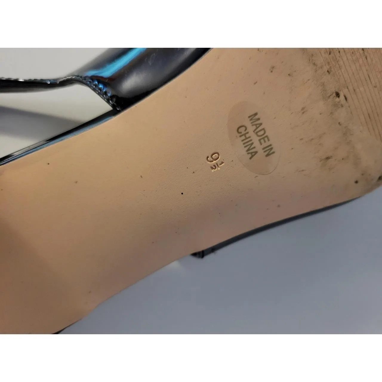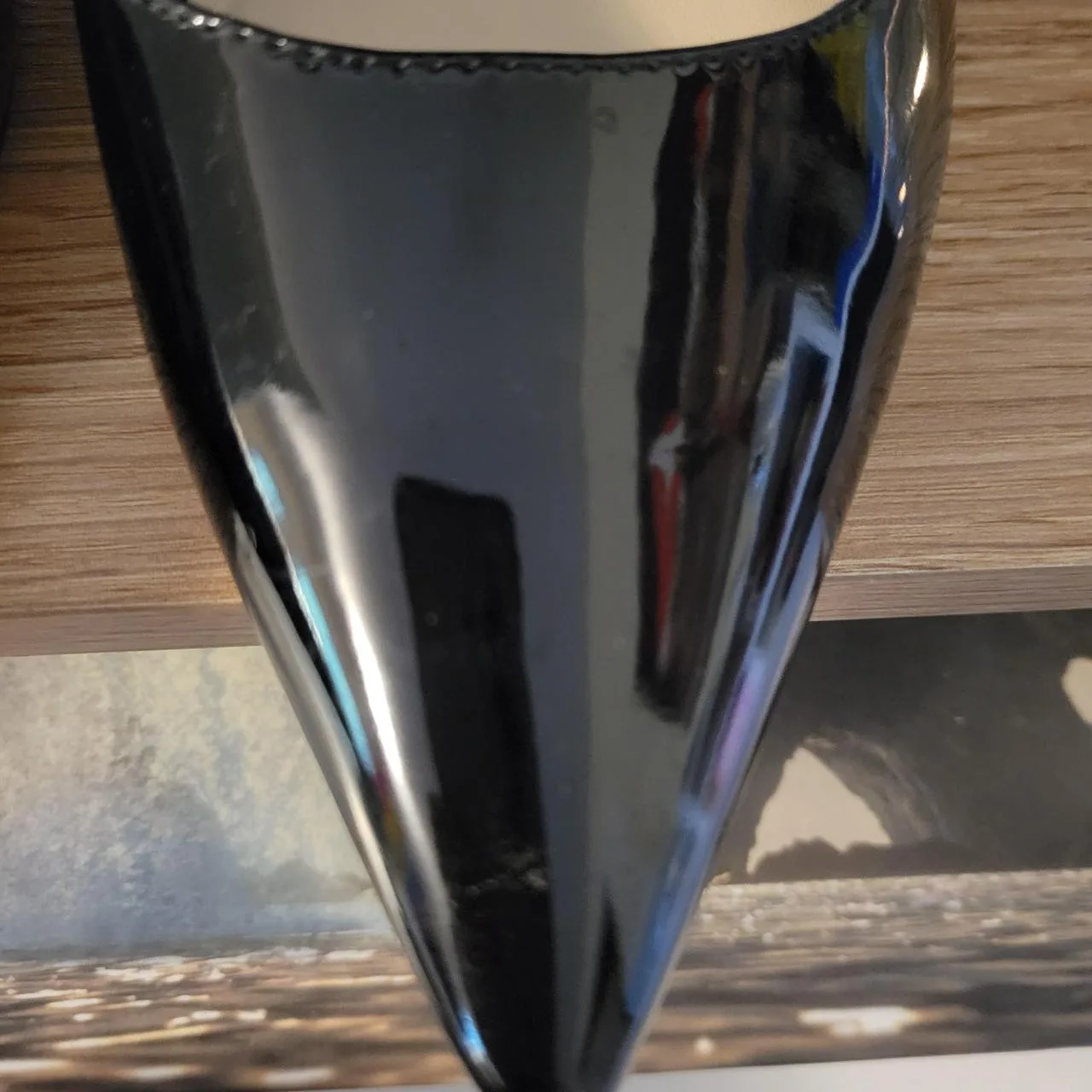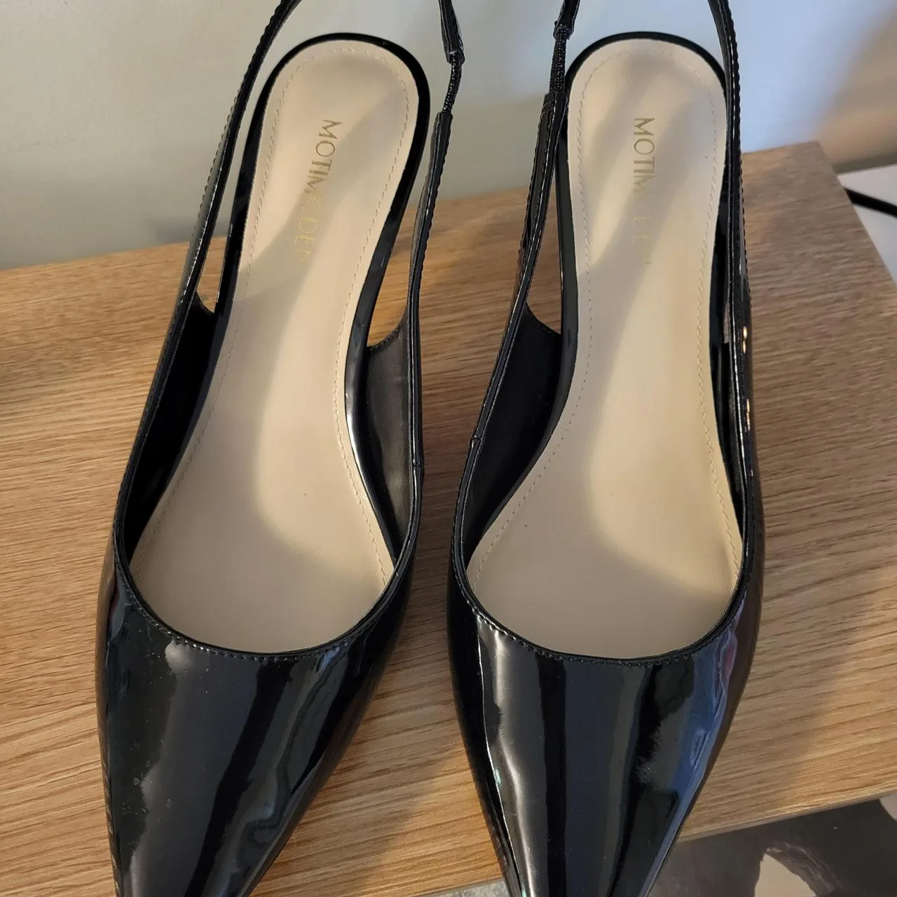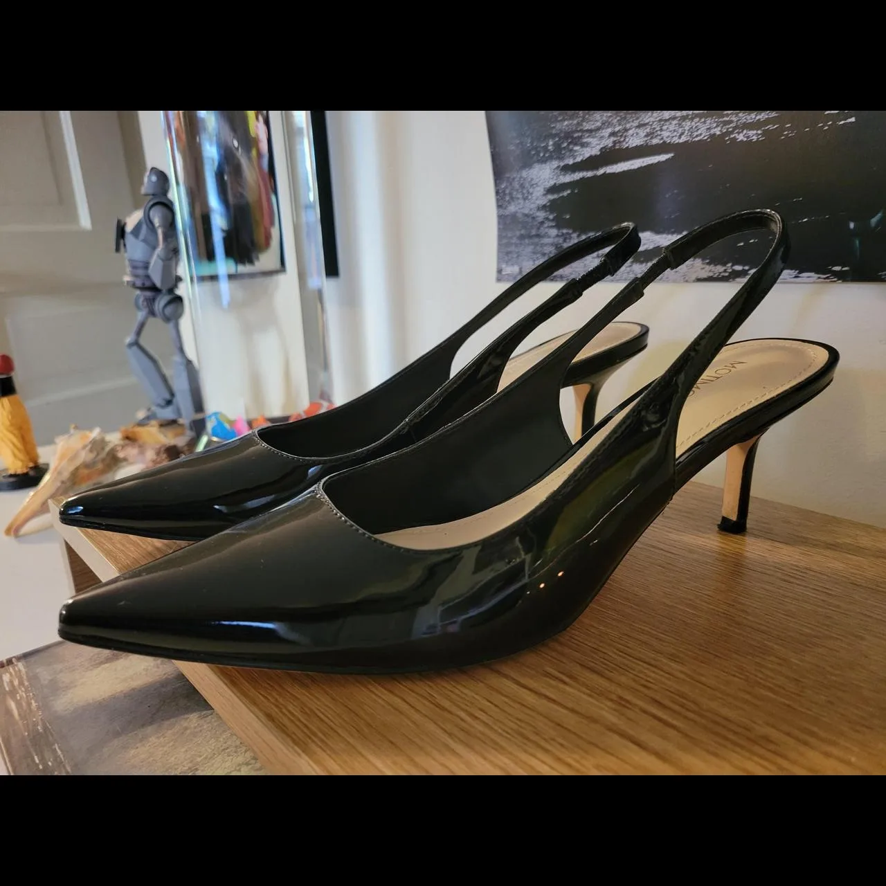 Black faux leather slingback kitten heels that were only worn once! Wore these to a wedding and they’re both comfortable and durable. The closure type is elastic pull-on, and kept the shoes put together for hours of wear! Noticeable flaws are pictured 📷 these shoes are snug so keep that in mind (please give these shoes some love because they made a sista look/feel too good)