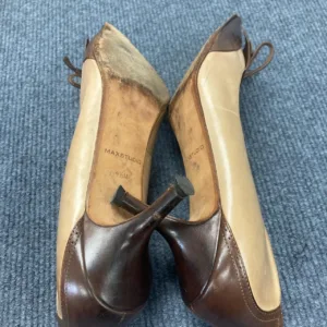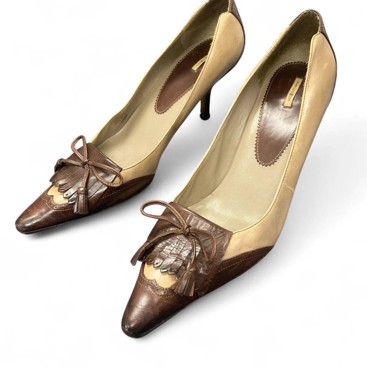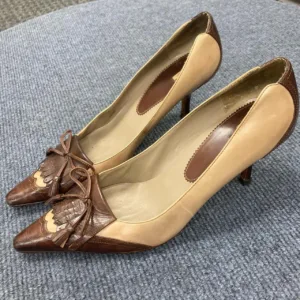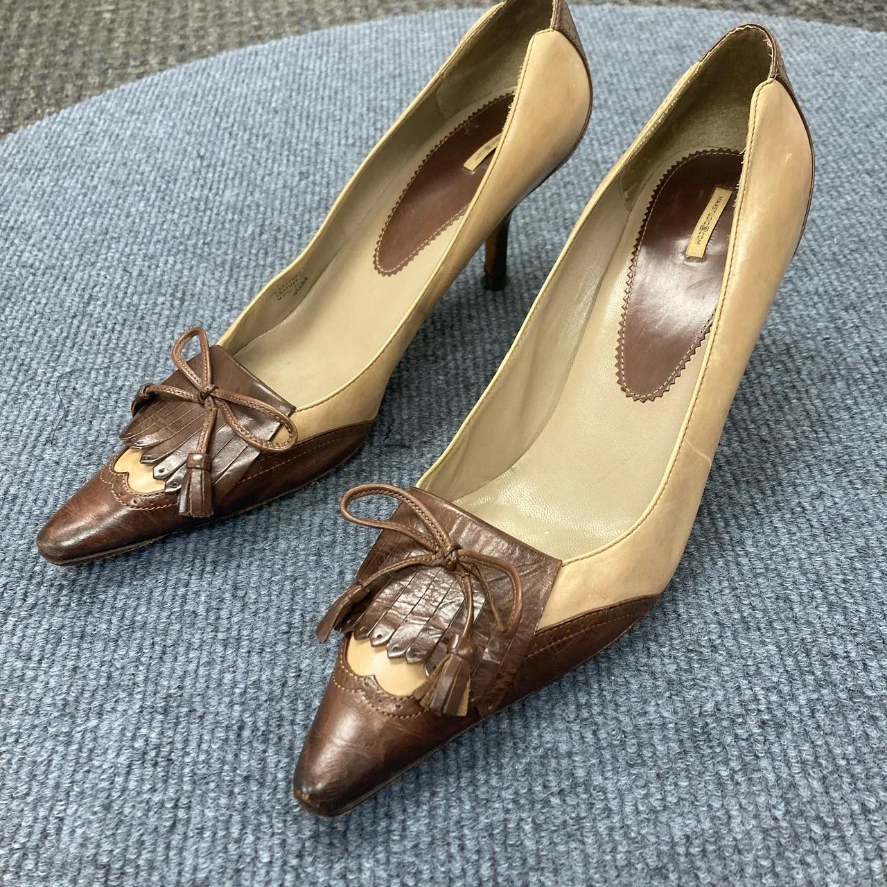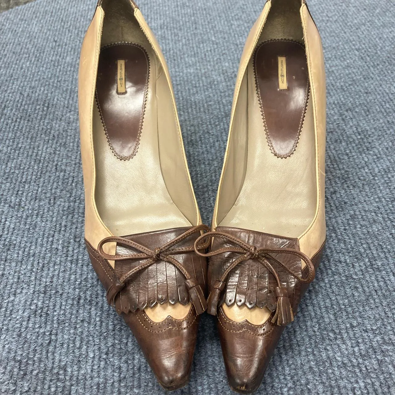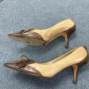 y2k pointed toe kittens 🐈⬛🎀 adorable dainty genuine leather choc caramel heels w/ front mini bow 🤎perfect for 90s/00s preppy coquette uptown girl looks🌟brand: maxstudio, size 9.5 #kittens #coquette #preppy #y2k #mules