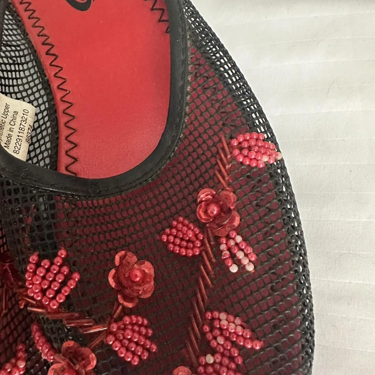 Red and black floral embroidered mesh slides