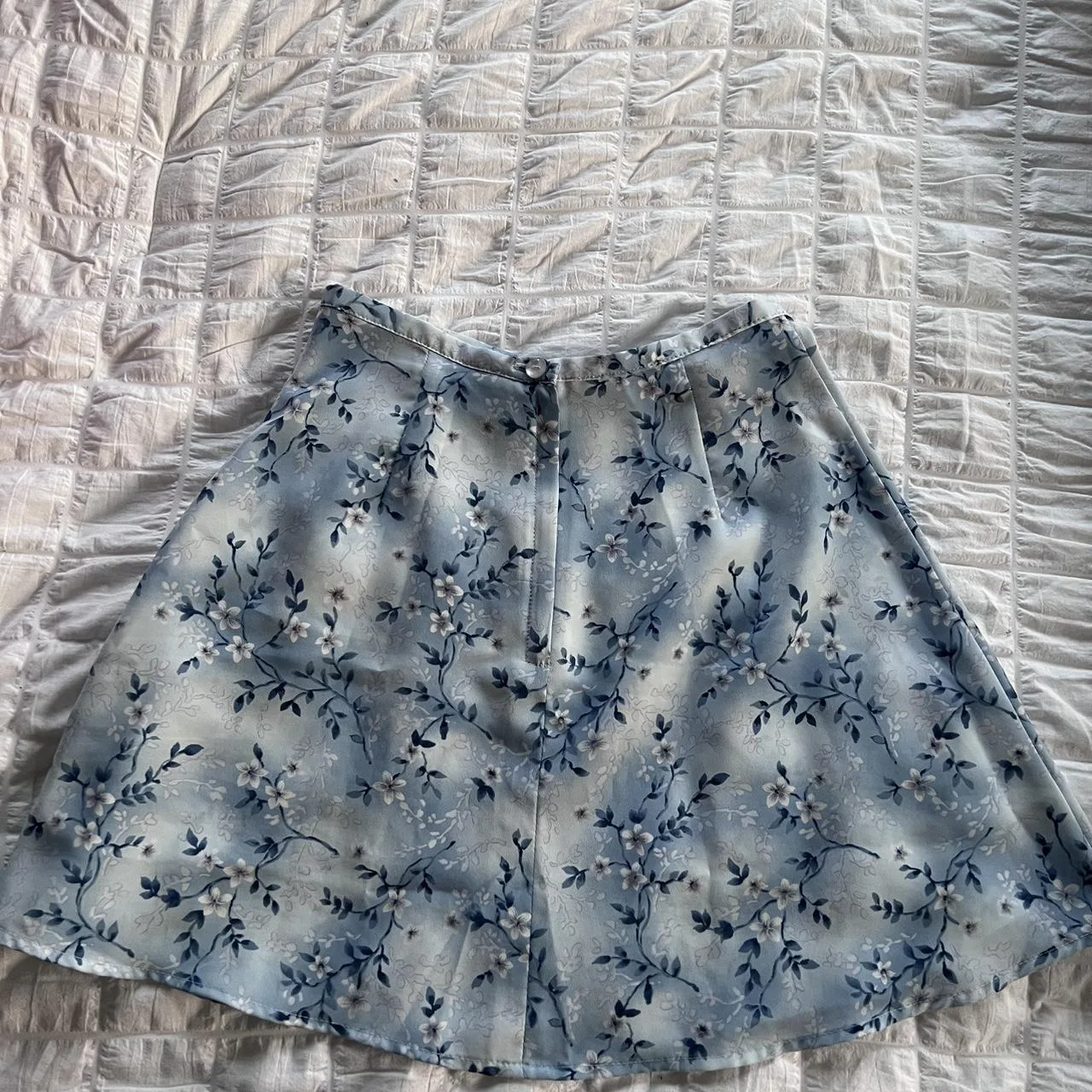 gentle floral, pastel blue, flowy fabric, mini length, button detail, zipper closure, lightweight material, cottagecore style, 2000s inspiration, thrifted fashion